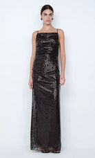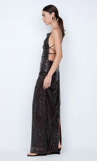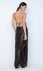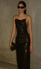 Romilly Maxi Dress in Dark Chocolate. This sequin backless maxi dress, features a high boat neckline and an open back with delicate self-ties, creating a dazzling column silhouette perfect for a glamorous evening event or a chic night out.