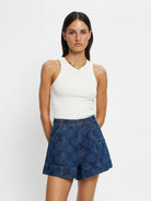 The Evita Denim Short is an A-line silhouette, crafted in a printed coral design. Featuring Jett pockets, centre-back detailing and finished with signature hardware, this timeless style blends everyday ease with elevated edge. Pair with the Marla Denim Shirt for a polished co-ord look, or style with a blouse and heels for evening occasions.