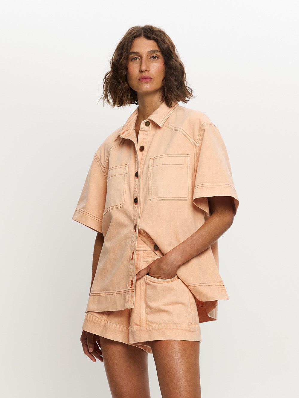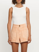 The Cameron Denim Short in peach features contrast topstitching, front and back pockets, complete with antique brass logo hardware.