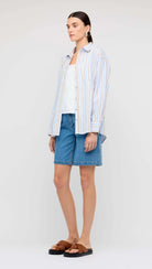 The Marcella Blue Stripe Cotton Oversize Shirt is a versatile staple reimagined in a fresh striped cotton. Made from 100% lightweight cotton, it features a relaxed oversized fit, button-through front, collared neckline, and chest pocket detailing. Style it open over swim, half-tucked into denim, or pair it with the matching Marcella Maxi Skirt for an elevated striped set.