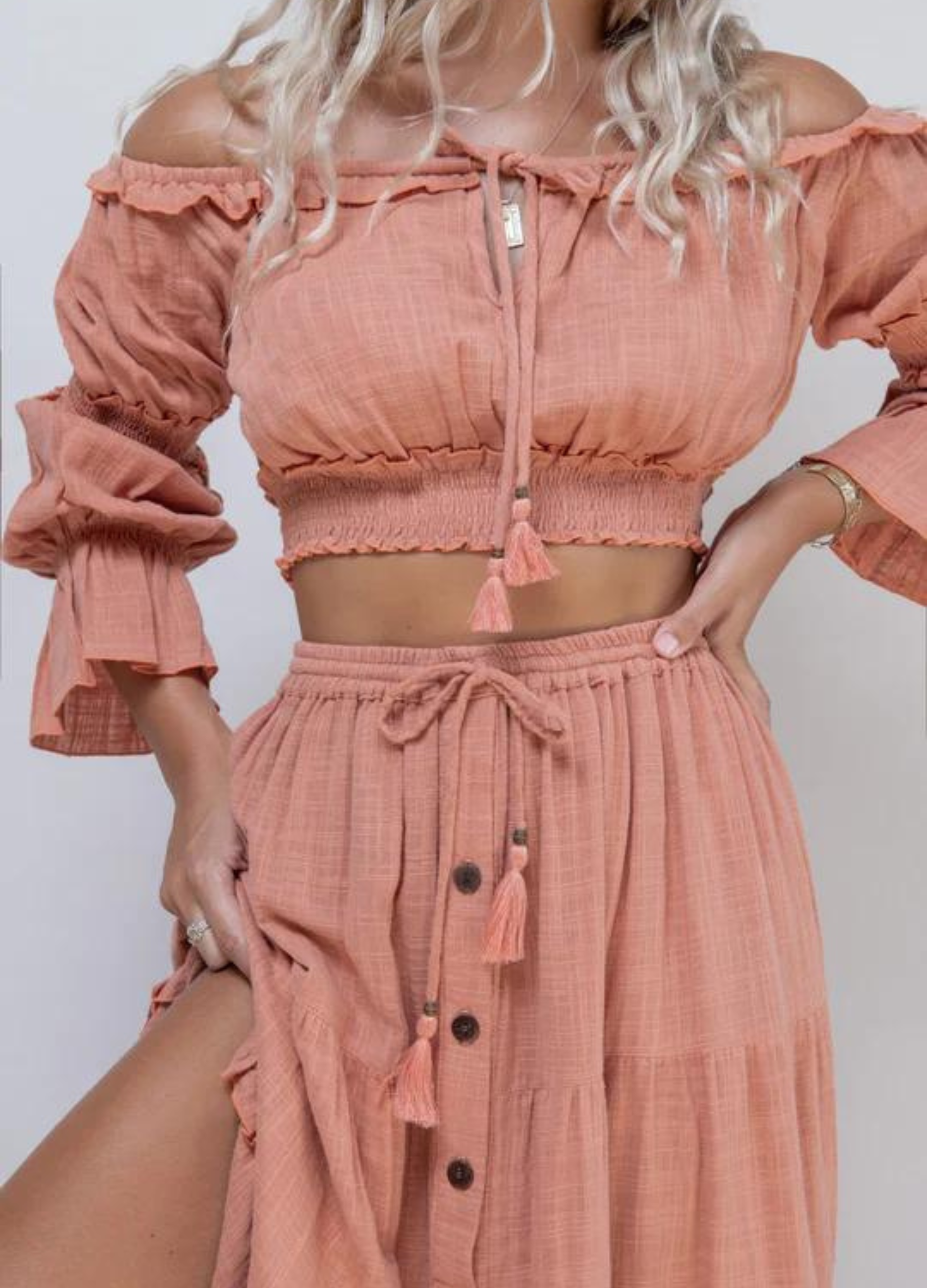 Tropical Dream - Elbow Sleeve Esmeralda Off Shoulder Crop Top - Dusty Pink