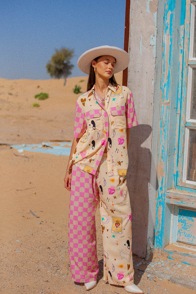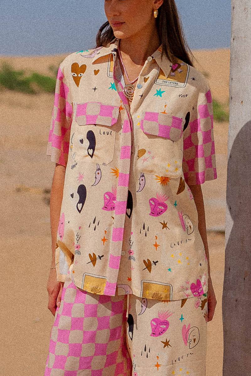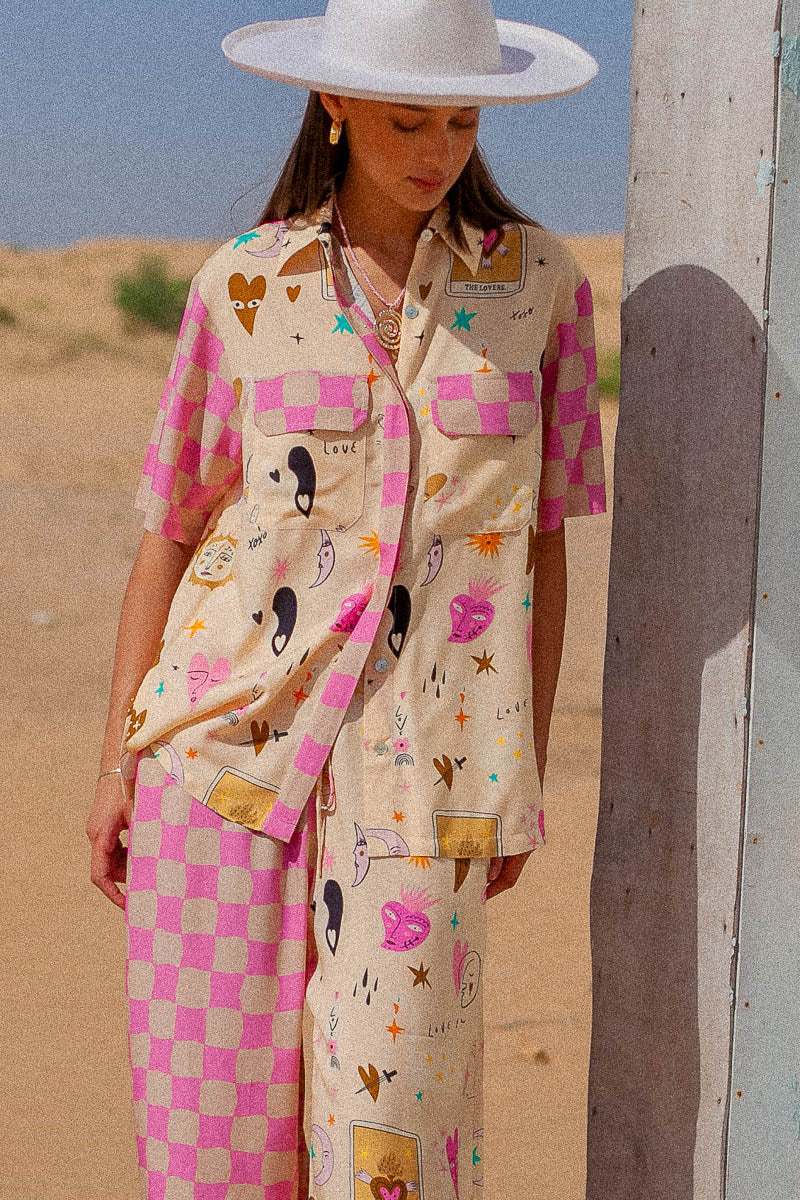 The new Lovers blouse features the exclusive Palm Collective Valentines print on a cream base with pink check detail. Featuring bunnies, ying yang hearts, swans, tigers, plus more, and coupled with spliced check sleeves. With a relaxed fit, the shirt features side splits, placket detail and front patch pockets.