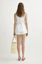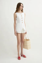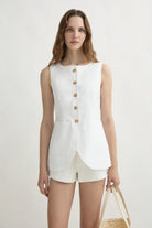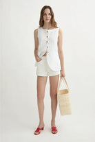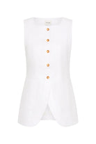 A POSSE signature, the Emma Vest is tailored from premium linen in a structured, classic silhouette. It features a refined high neckline, scooped hem and mottled buttons through the centre front, with an adjustable back buckle to perfect the fit.